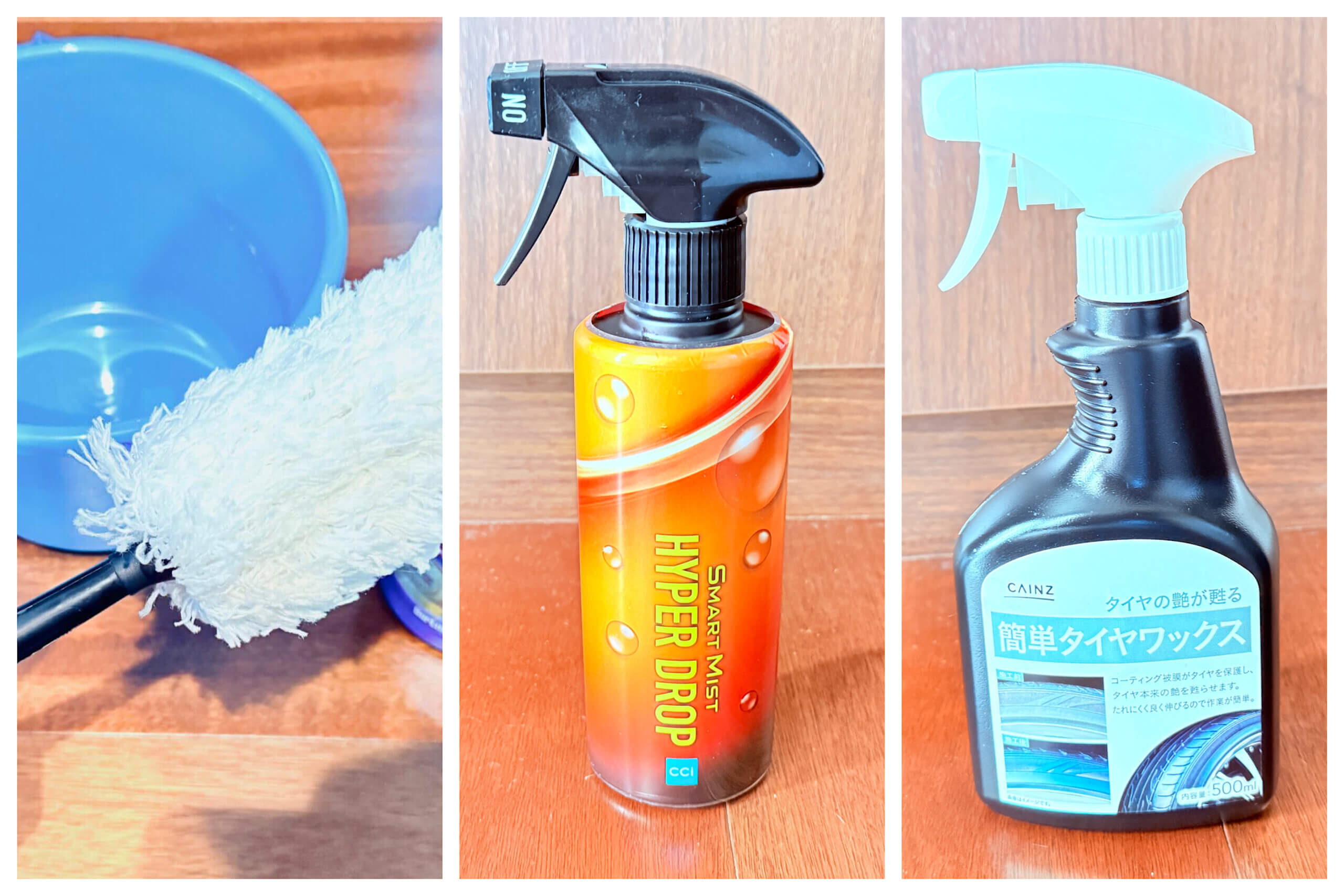 こちらのカインズの安いタイヤワックスで充分。水性なのでタイヤへのダメージもありませんし、気軽に使うことができます。