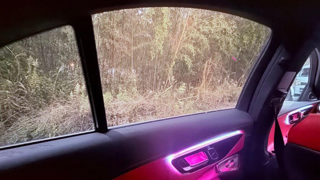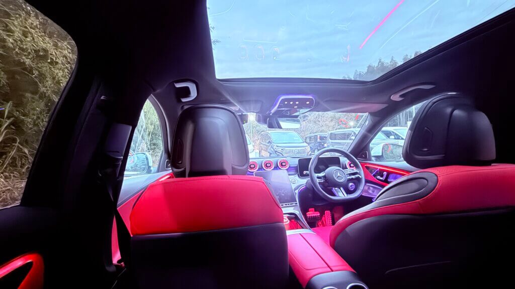 車内のインテリアやアンビエントライトの見え方は、写真の通り。これが後部座席の乗員の視界ということになります。
