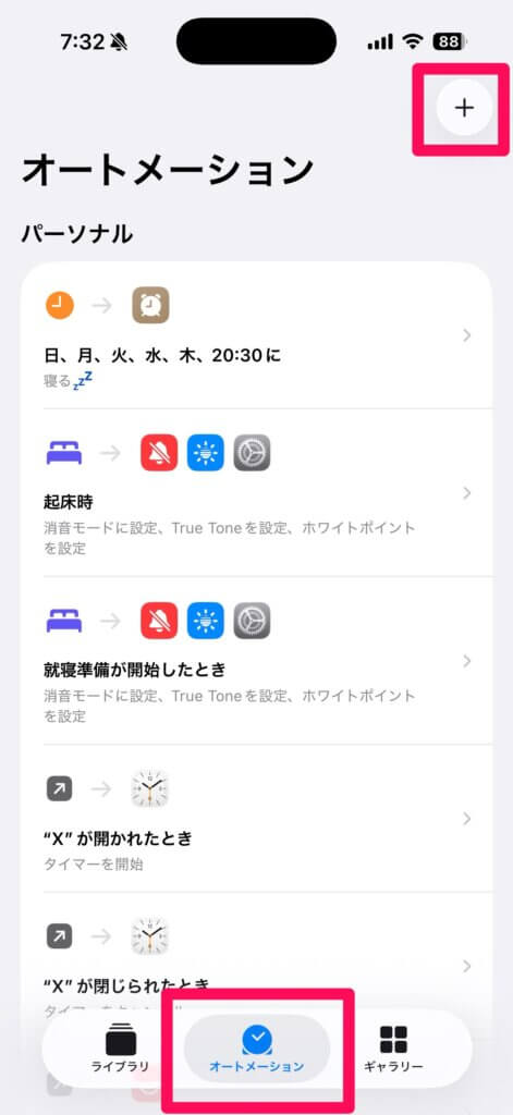 では、右上の「+」ボタンを押して、新しいオートメーションを作成しましょう。