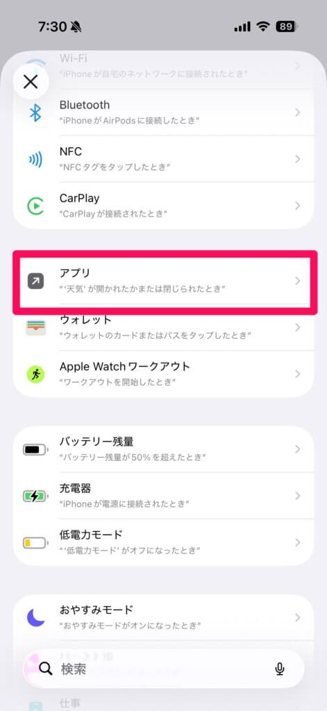 Xアプリの起動に合わせて実行したいわけなので、「アプリ」を選択。