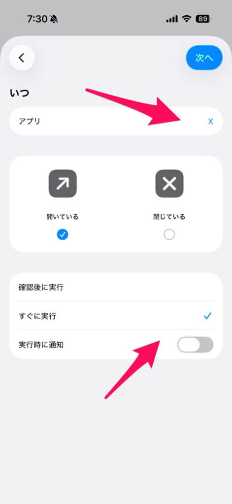 そして下段。ここはポイントで、「すぐに実行」を選択し、「実行時に通知」はオフの状態にしておきます。画像のようになっていれば大丈夫。