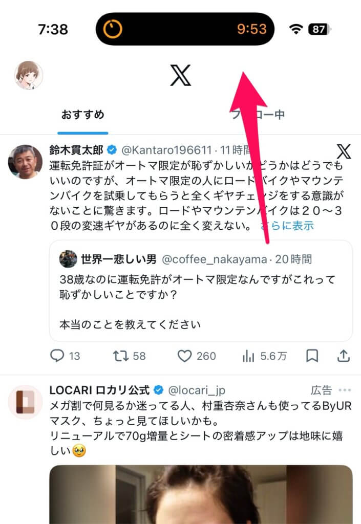 上記の設定ができた状態でXを開くと、自動的にバックグラウンドでタイマーがセットされます。Dynamic IslandのあるiPhoneを使っている場合、そこにタイマーが常駐することになりますので、残り時間も常時表示されます。