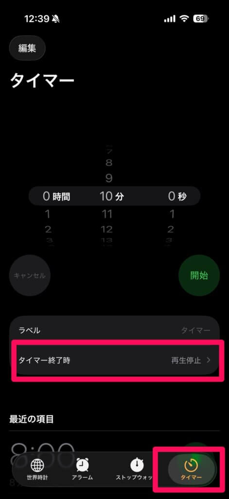 時計アプリのタイマーの画面で、「タイマー終了時」を「再生停止」にします。